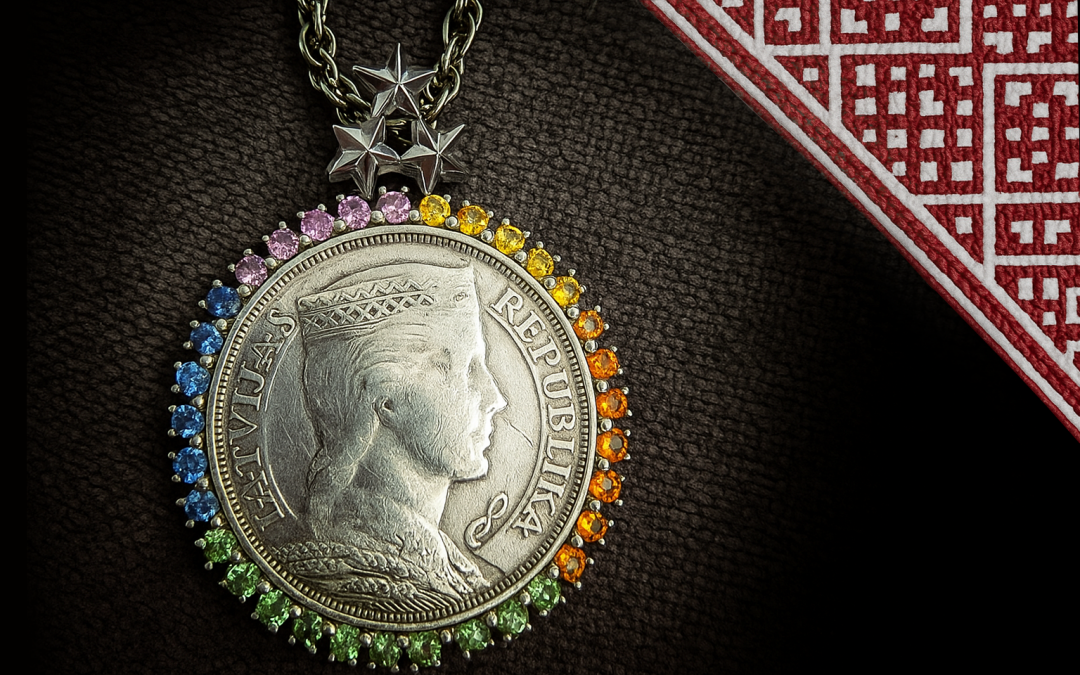 The centerpiece of the exposition is the silver pendant “Milda” — an original 5-lats coin minted in 1932, glowing in the light of coloured sapphires — along with a lats coin holding a gingerbread heart, transformed into an exquisite pendant shimmering in the radiance of rock crystal. These works are more than jewellery; they are symbols of reverence for a past in which metal spoke the language of beauty and heartfelt warmth.